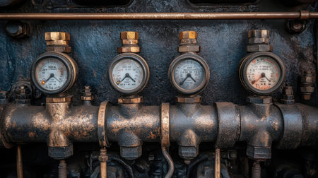 Detailed image of vintage pressure gauges mounted on industrial pipes, showcasing metal textures and rust. Ideal for themes of machinery and engineering.