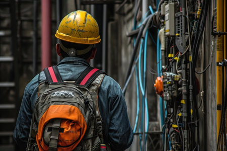 Uniformed Back view of standing worker in uniform. Workman wearing safety helmet and working equipment. Generate ai