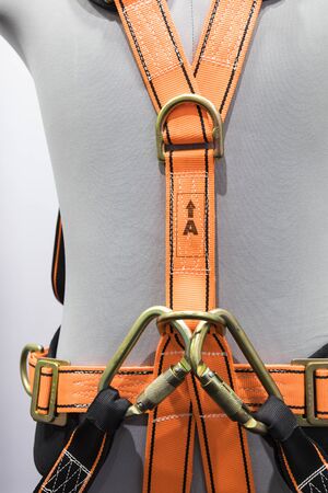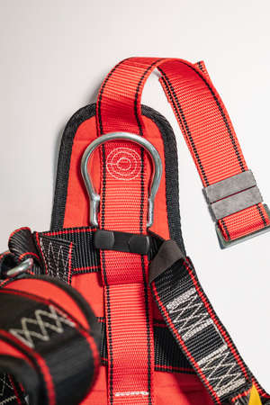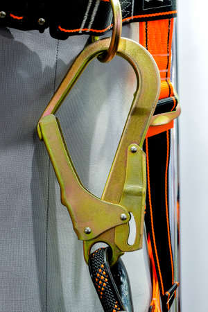 Safety belt for work at height with carabiner. Professional safety equipment for mountaineering and construction. safety precautions. close-up