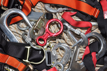 rock climbing gear,close up of Mountain climber wearing carabiners