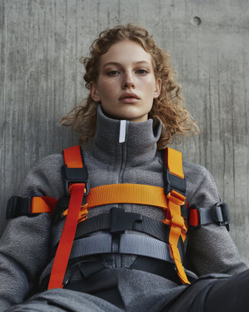 Portrait of woman in gray techwear with vivid orange safety harness. AI-generated.