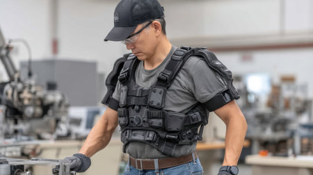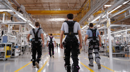 Workers utilizing advanced exoskeleton suits in a modern manufacturing facility during daytime operations
