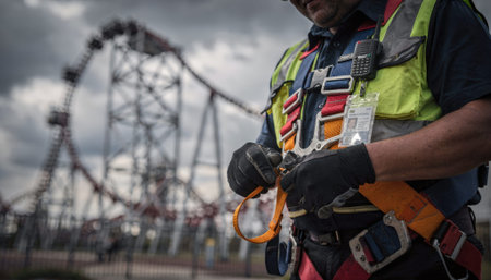 Closeup of a worker checking roller coaster harnesses under cloudy skies focusing on safety equipment while the ride structure fades softly behind.