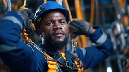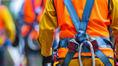 Close-up of construction worker tying safety harness, focus on safety and detailed gear,