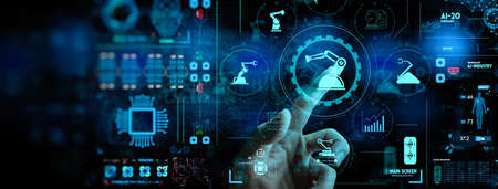 Futuristic industry 4.0 and inventive mechanized engineering concept with graphic user interface showing automation design, robot operation, usage of machine deep learning for future manufacturing.