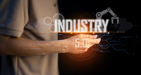 Engineer use augmented reality software in smart factory production line with automated application . Futuristic machinery in working in concept of Industry 4.0 or 4th industrial revolution.