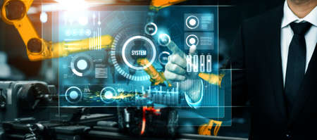 Engineer hand check and control welding robotics automatic arms icon with machine in intelligent factory automotive industrial with UI monitoring system software.