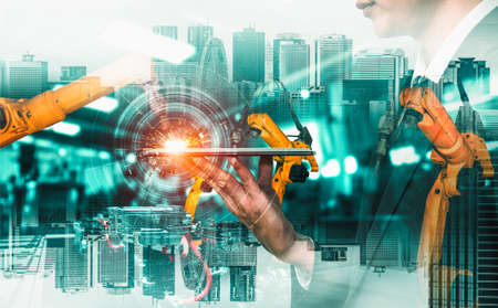 Engineer controls robotic arms by augmented reality industry technology application software. Smart robot machine in future factory working in concept of Industry 4.0 or 4th industrial revolution.