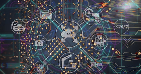 Image of integrated circuit and tech icons over lines on black background. Global network, data processing, and technology concept digitally generated image.