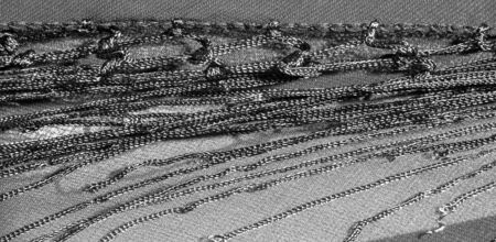 This close view shows a beautifully woven fabric made from natural fibers. The textured pattern highlights its craftsmanship, emphasizing the ropes and threads used in the design.