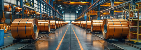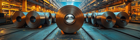 Industrial scene of large steel coils lined up in a factory, showcasing precision and scale