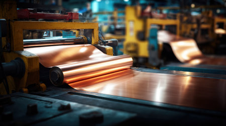 Medium shot of an automatic rolling machine smoothly flattening copper sheets with precision in an industrial environment.