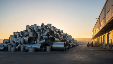A vast quantity of industrial metal pipes is piled in an outdoor lot adjacent to a modern warehouse. The scene is bathed in the warm, soft light of sunrise, casting long shadows and highlighting the metallic sheen of the pipes. A forklift is visible near the warehouse loading docks, suggesting ongoing industrial activity. The sky is clear with a gentle gradient of orange and yellow.