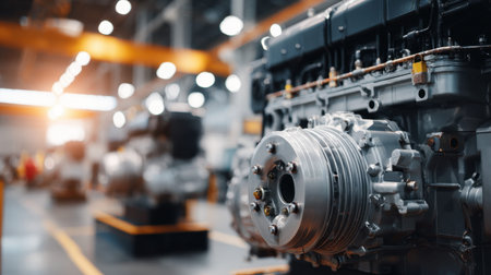 A detailed view of an engine on an assembly line in a modern factory, showcasing the precision and technology involved in automotive manufacturing.