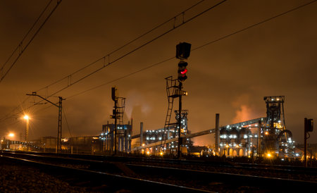 Industrial landscape with railroad tracks and factory at dusk. Long exposure