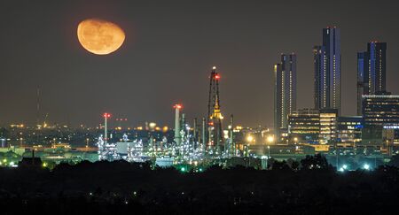 business and industrial area production plant or refinery crude oil and gas for transportatioon and export, aerial photography at night scene from drone,