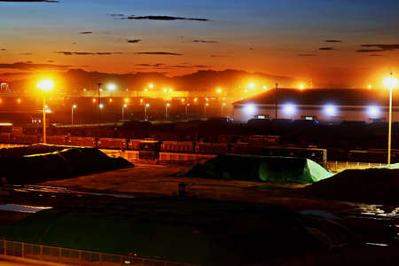 Bright floodlights illuminating the still dark corners of the site casting long shadows of the machinery