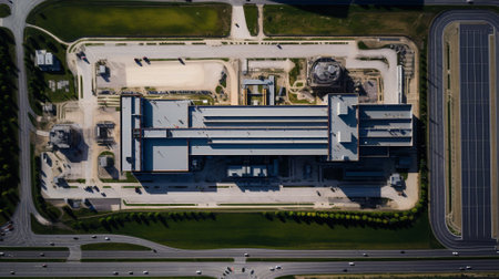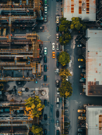 Captivating aerial perspective of an industrial site showcasing arranged machinery and structures, providing insight into operational logistics and urban infrastructure.