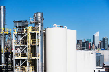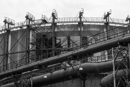 Oil refinery or petroleum refinery plant. Power and energy industry. Oil and gas production plant. Petrochemical plant. Chemical pipeline. Natural gas storage tank with sky. Petroleum engineering.