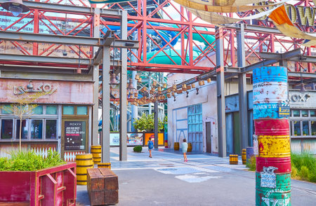DUBAI, UAE - MARCH 4, 2020: The colorful vintage barrels and metal constructions in La Mer Beachside shopping and dining district, on March 4 in Dubai