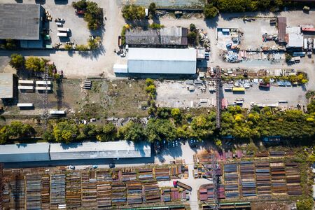 Top view of the industrial zone: garages, warehouses, containers for storing goods. The concept of storage of goods by importers, exporters, wholesalers, transport enterprises, customs
