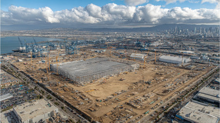 A stunning aerial view showcasing an industrial construction site bustling with activity, framed by a vibrant city skyline and dramatic clouds overhead.