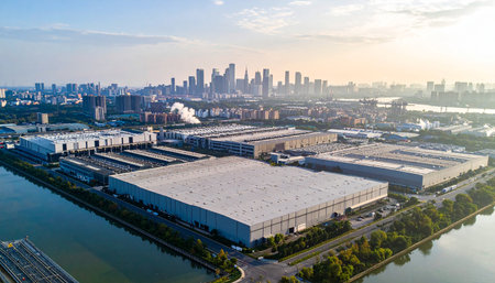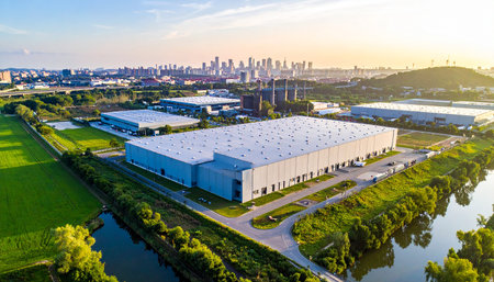 An overhead shot presents an industrial complex featuring warehouses, vehicles, and various buildings. The composition showcases a network of roads and structures. The image utilizes natural light, offering a detailed view suitable for diverse applications, including business and architectural contexts.