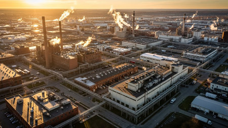 Sunset over a vast industrial complex, with silhouettes of factories, warehouses, and cooling towers against a dramatic sky, AI Generated