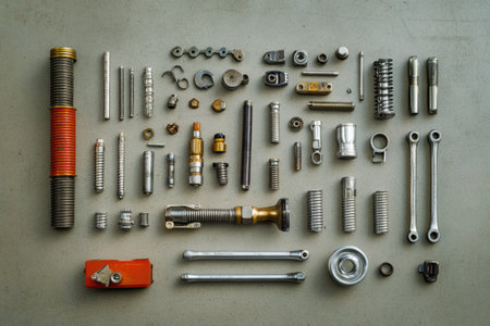A detailed arrangement of various mechanical parts and components showcasing the intricate design and engineering used in modern machinery and tools.
