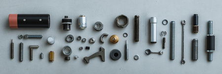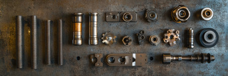 A visually striking collection of precision metal components and parts arranged methodically on a clean surface, ideal for industrial projects and designs.