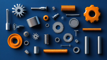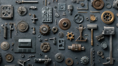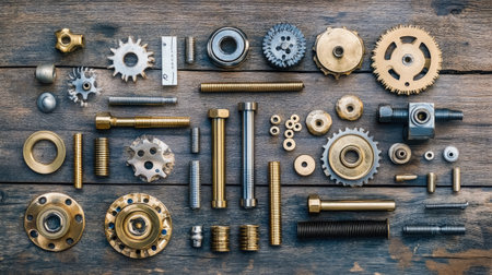 A diverse collection of mechanical parts and components elegantly arranged on a flat surface. Ideal for technology and engineering projects.