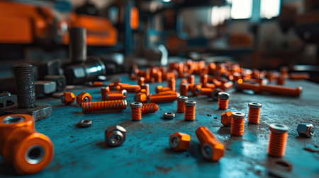 A vibrant close-up of assorted metallic fasteners, including bolts and nuts, scattered across a workshop table with a soft-focus background.