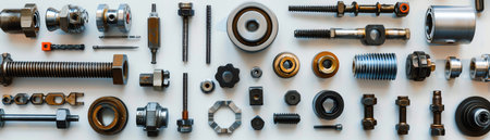 A detailed arrangement of various industrial mechanical parts includes screws, bolts, and diverse components ideal for engineering projects and design applications.