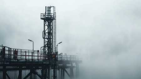 An oil platform stands tall in a coastal region, partially shrouded in thick fog during the early morning. The scene conveys a sense of isolation and industrial beauty.