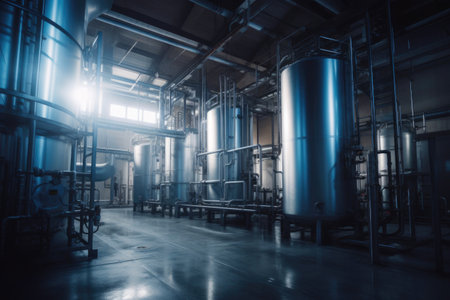 Drinking water factory production, industrial interior. Large metal tanks for filtering and potable water treatment from well.