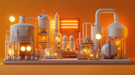 This image showcases a modern industrial production facility featuring a variety of pipes, tanks, and illuminated equipment. The vibrant orange background enhances the intricate details of the machinery, highlighting innovation in manufacturing processes.