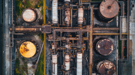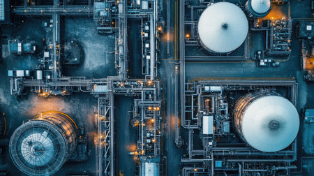 An aerial perspective showcasing an industrial plant featuring intricate pipelines and large storage tanks, highlighting modern engineering and production processes.