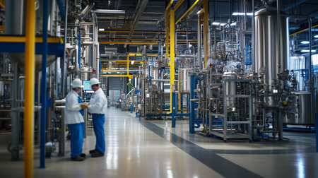 High-tech biopharmaceutical manufacturing facility with bioreactors, automated machinery and scientists overseeing production of biopharmaceuticals highlighting the precision and technology involved.