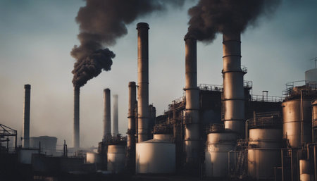 Black smoke escapes from tall chimneys in an industrial complex, creating a dramatic contrast against the overcast sky.