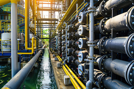 An expansive view captures the intricate pipeline system connecting to a water treatment plant, highlighting its sleek design and industrial efficiency.