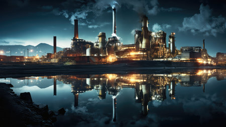 chemical plant smokestacks installation at night, chemical industry, generative ai