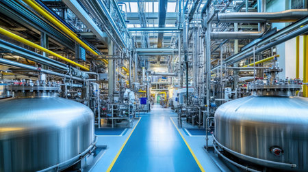 A network of pipes and valves weaves its way through a vast industrial building, showing the intricate system responsible for regulating fluids and gases.