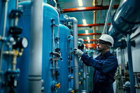 An engineer attentively monitors a state-of-the-art water purification system. His focus reflects the precision required in modern environmental technology