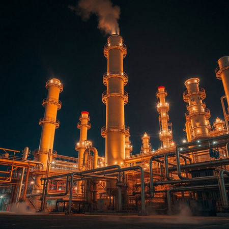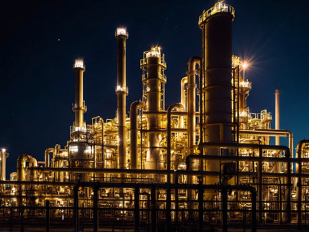 The oil refinery comes alive at night with glowing industrial lights highlighting its towering structures against a moody sky.