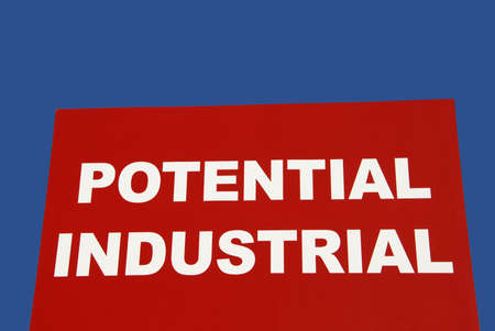 A powerful image of a raised fist in the foreground of a large, modern industrial factory with machinery in the background
