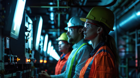Engineers Working on a Large Control Panel in a Power Plant. AI generative