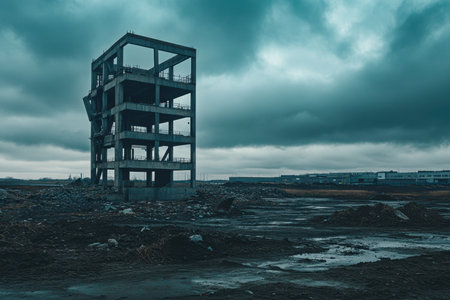 This striking image captures an abandoned concrete structure amidst a desolate landscape and a moody sky, evoking a sense of loneliness and decay.