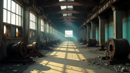 Dusty rays of light filter through shattered windows of an abandoned factory, illuminating rows of rusted machinery. Shadows stretch across the worn floor, echoing silence and history.