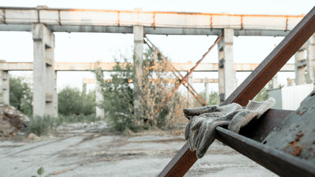 Dirty textile work gloves on metal stairs. Industrial zone, urban landscape with blurred background.