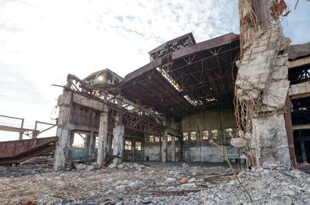 Remains of destroyed industrial building with internal communications. Demolition of building on territory plant. Background with dilapidated building and fragments of bricks and construction debris